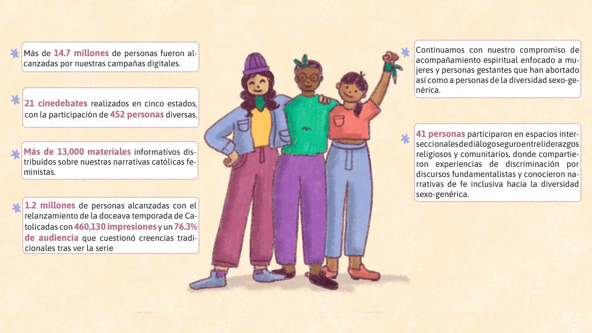 En 2024 Católicas por el Derecho a Decidir reafirmamos nuestra vocación de tender puentes entre la fe, los derechos y la justicia social. A lo largo de este año, tejimos alianzas, narrativas y acciones que nos permitieron avanzar en nuestros objetivos estratégicos: transformar creencias, fortalecer el acceso a derechos y participar activamente en los ecosistemas feministas locales, nacionales e internacionales.