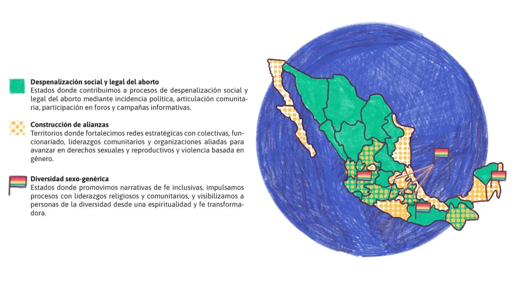 En 2024 contribuimos activamente a consolidar territorios más justos, libres y diversos. Este mapa representa el alcance territorial de nuestras acciones, estructurado en tres ejes clave: la despenalización legal y social del aborto, la construcción de alianzas feministas y la promoción de la inclusión de la diversidad sexo-genérica desde una mirada de católica progresista.